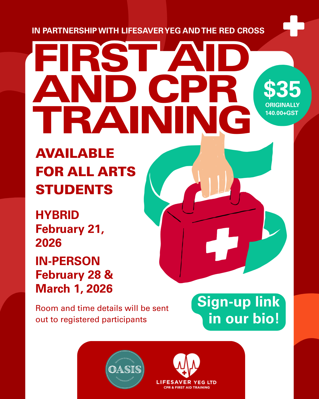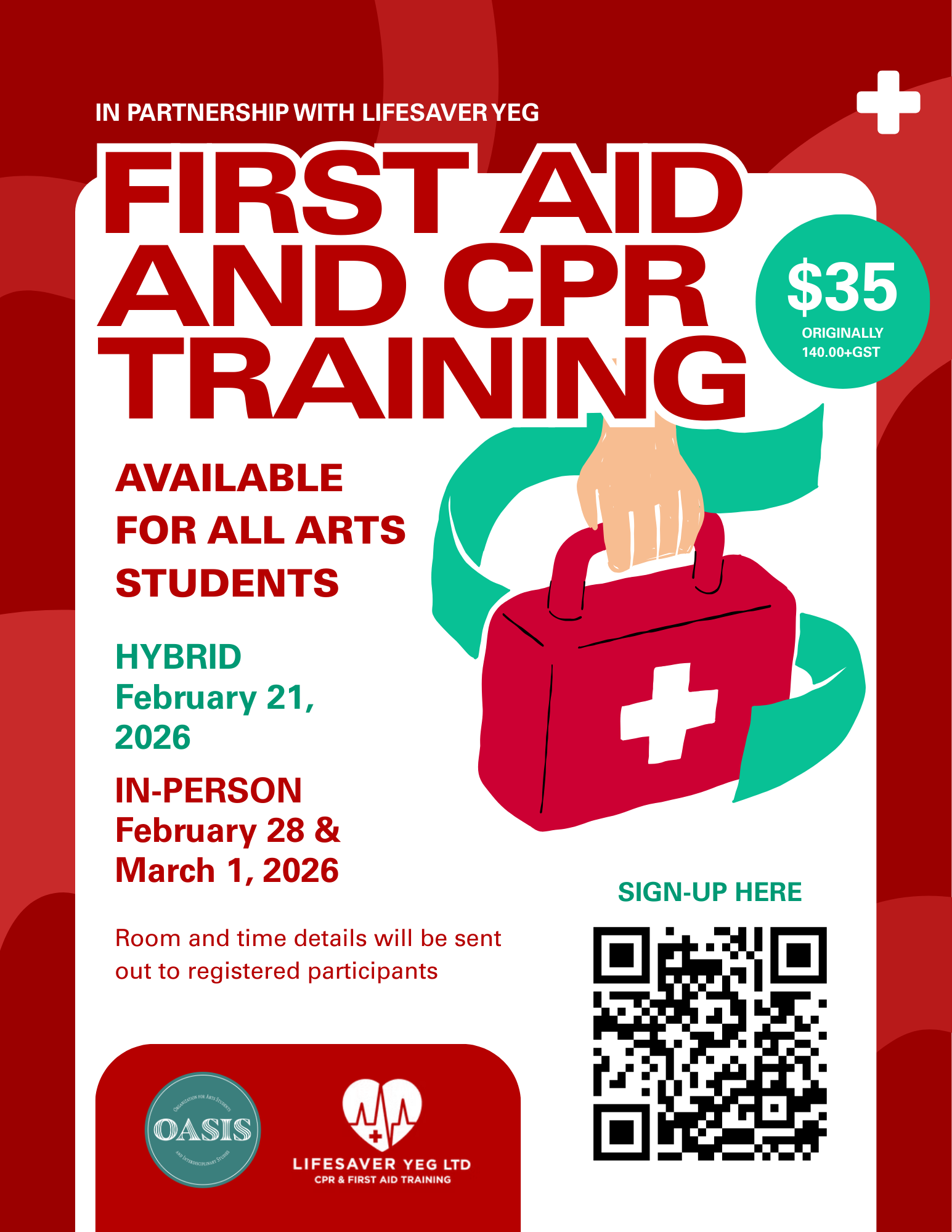 Come build your transferable skills with OASIS! First Aid and CPR training strengthens your resume and builds your confidence in high-stress settings. For a flat fee of $35, Arts students can receive their First Aid and CPR training from the original price of $140+gst.